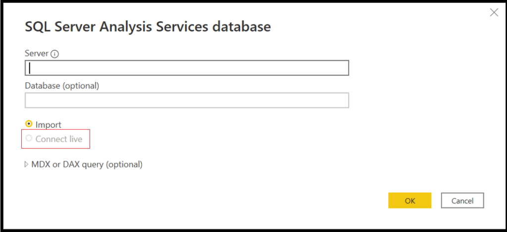 - When connecting to SQL Server Analysis Services, there’s an option to use connect live.